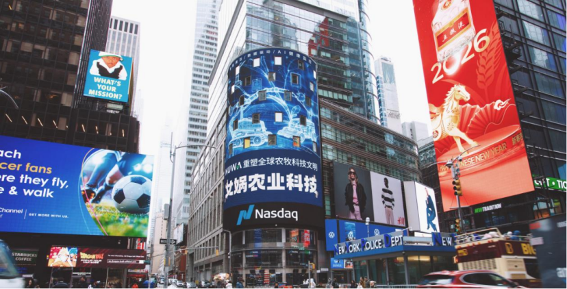 今年春节期间,女娲农业科技首次亮相纽约时代广场纳斯达克塔楼大屏,在全球资本市场的中心位置点亮“中国农牧科技”的名字。这一画面不仅象征着中国农业科技企业走向世界,也释放出一个信号:全球农牧产业的智能化变革,正在加速到来。